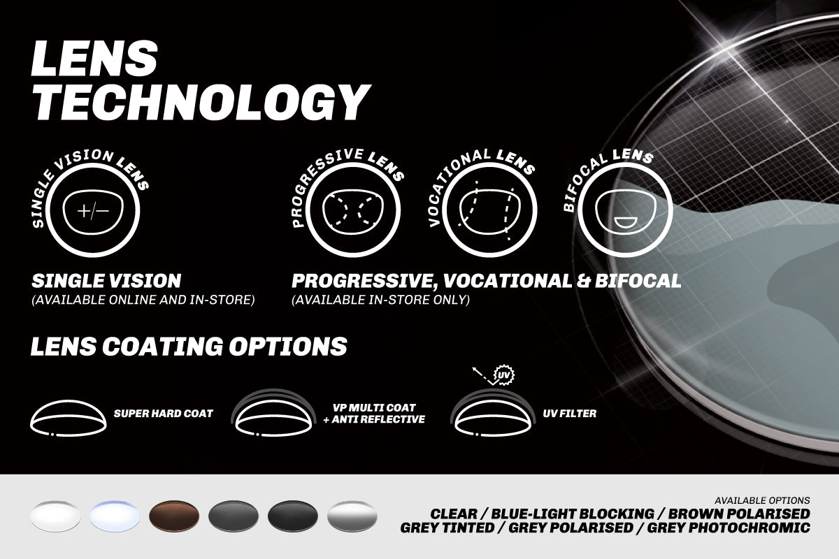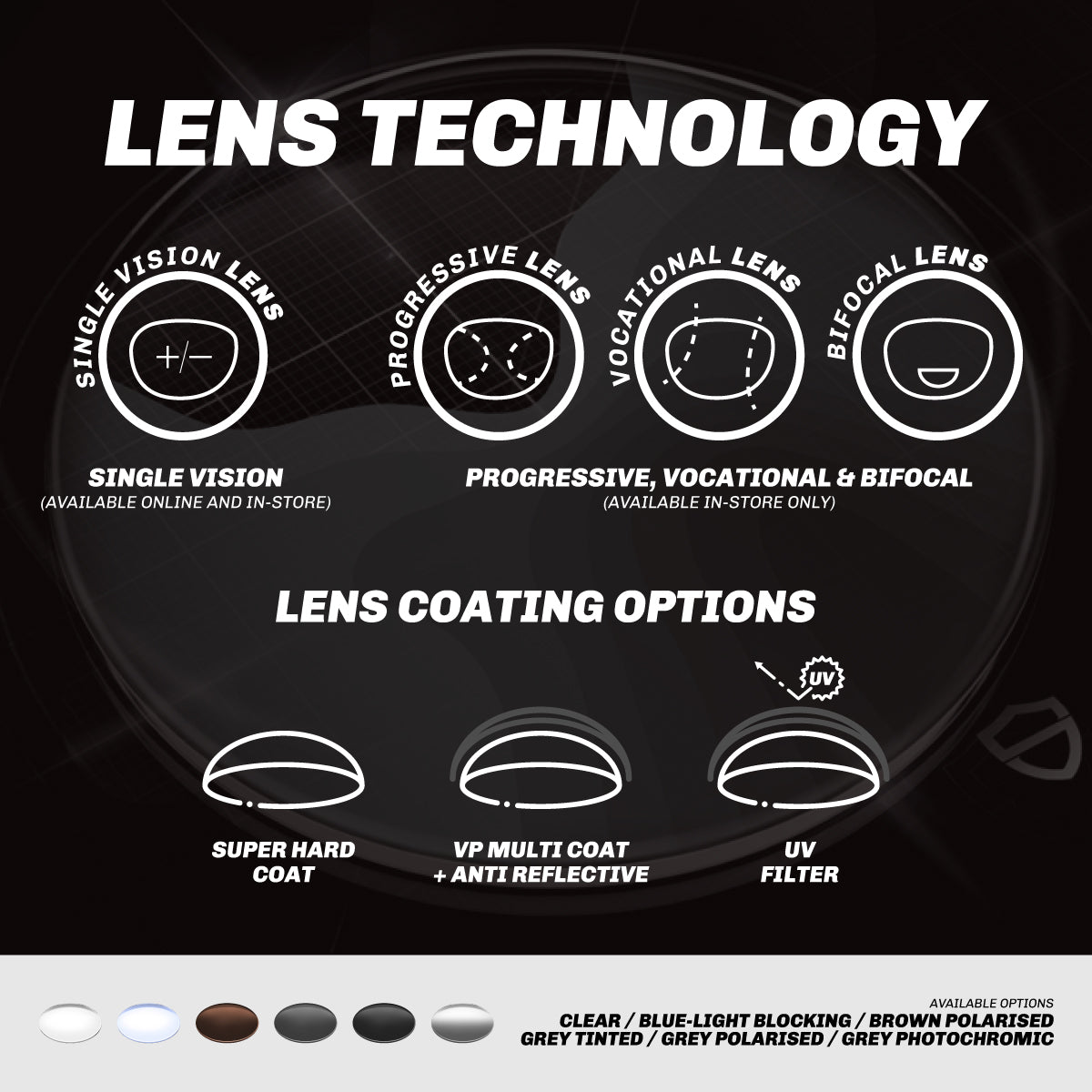 Clear/Blue-Light/Tinted/Polarised Grey/ Polarised Brown/ Photochromic