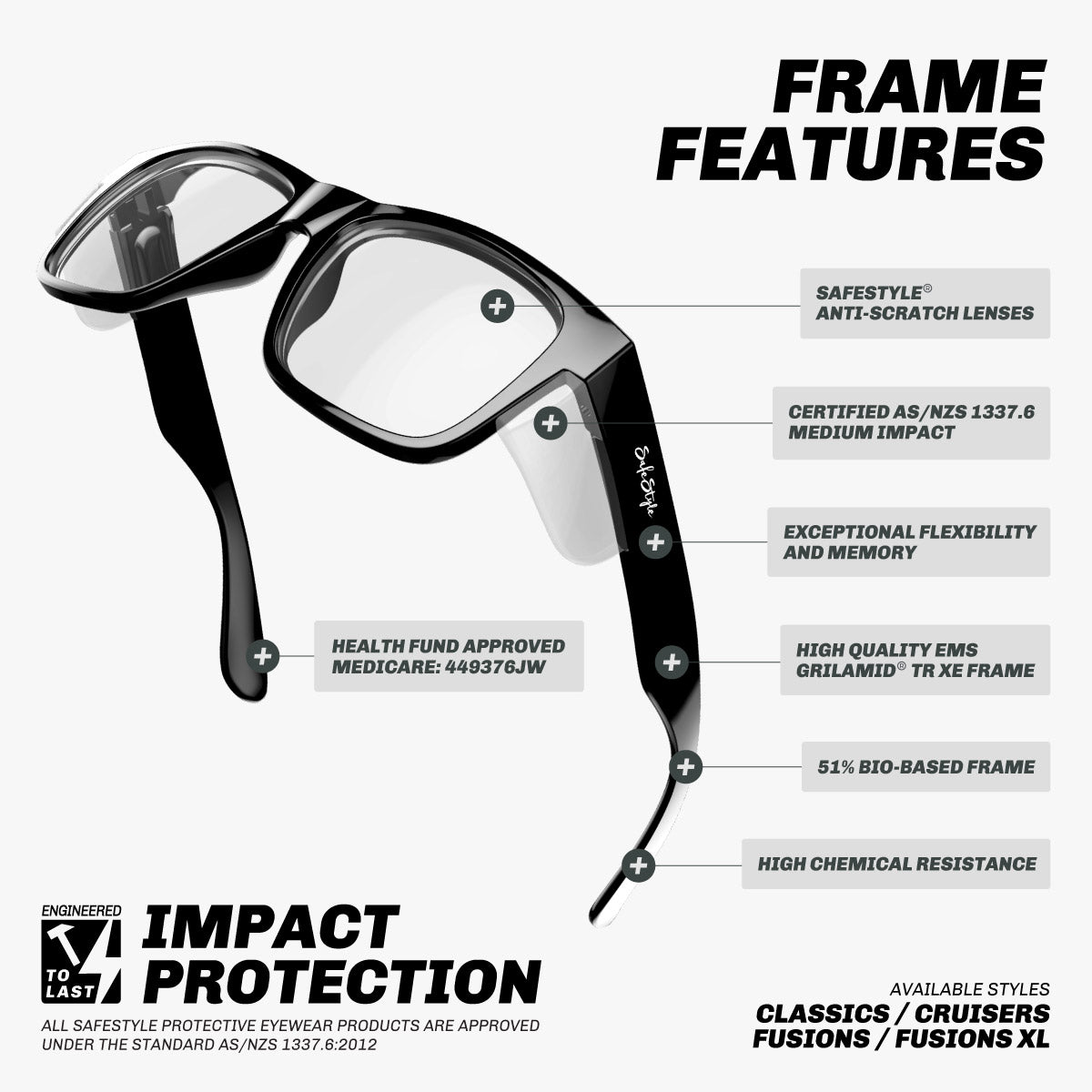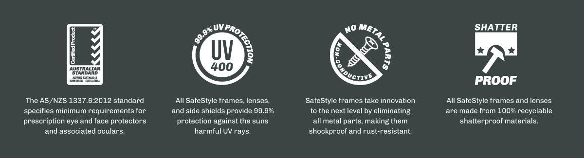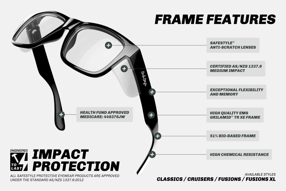 SafeStyle Prescription sets the standard with its advanced frame and lens technology. Crafted from EMS Grilamid® TR XE, our frames combine exceptional toughness, flexibility, and memory with high chemical resistance, ensuring durability in diverse conditions. What's more, these frames are 51% bio-based, reflecting our commitment to sustainability without compromising on quality or performance. Paired with Safety Certified Australian lenses, known for their optical excellence and precision, our Protective Eyewear ensures not only stylish protection but also uncompromised clarity and comfort.