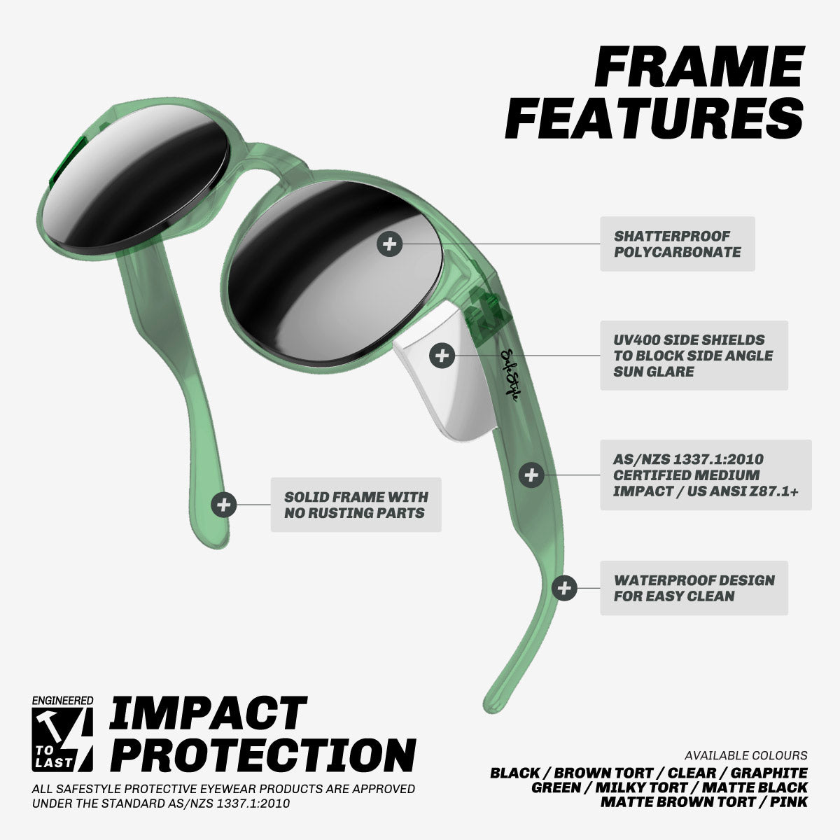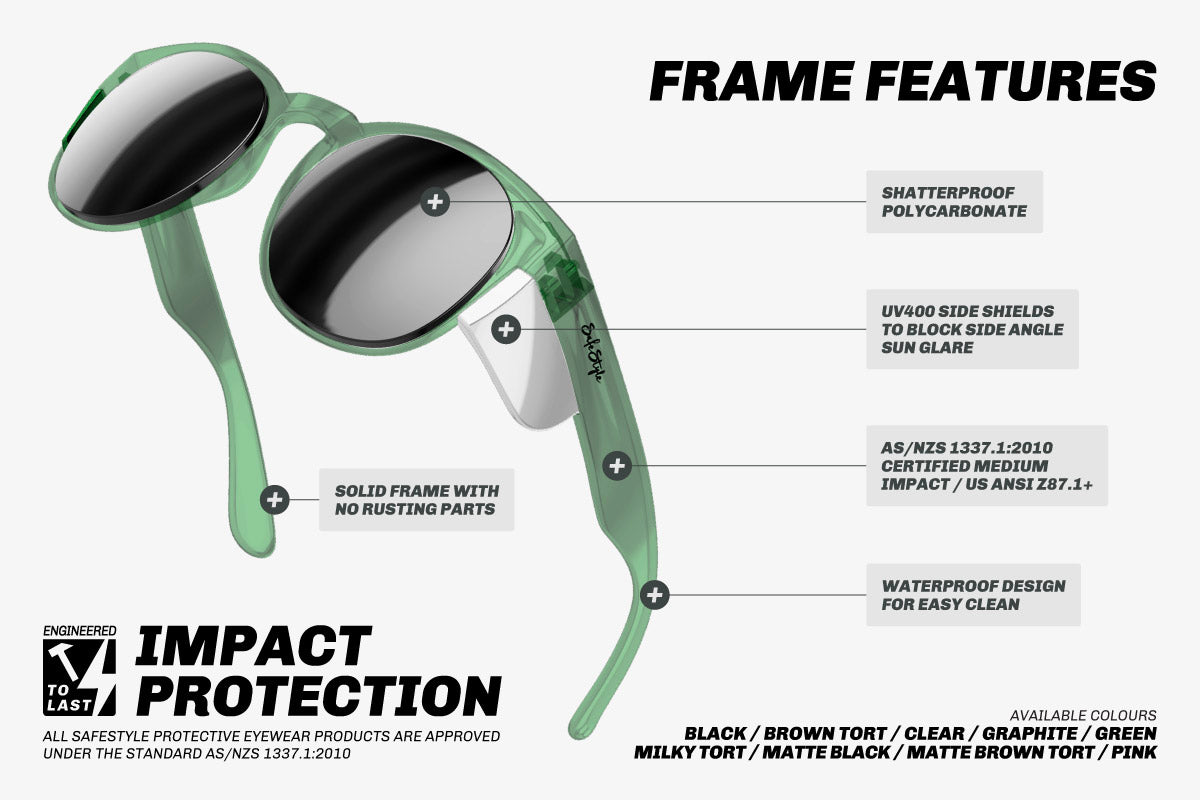 Take it all on with the SafeStyle Cruisers, our retro inspired circular-shaped lens that allows you to switch between work and play effortlessly. Don’t let the look of these safety glasses fool you, the impressive styling certainly does not compromise safety. The Cruisers are AS/NZS 1337.1 certified & are ready for action