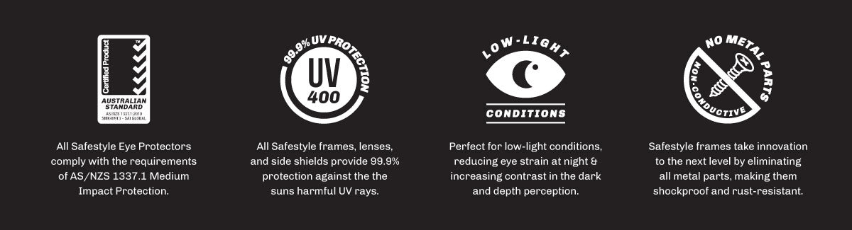 Get the best eye protection in the game with the SafeStyle Fusions safety glasses range. This best-selling, stylish rectangular frame design turns heads wherever you go. Certified to AS/NZS 1337.1 safety standards & built to last, there is no going past a pair of SafeStyle Fusions.