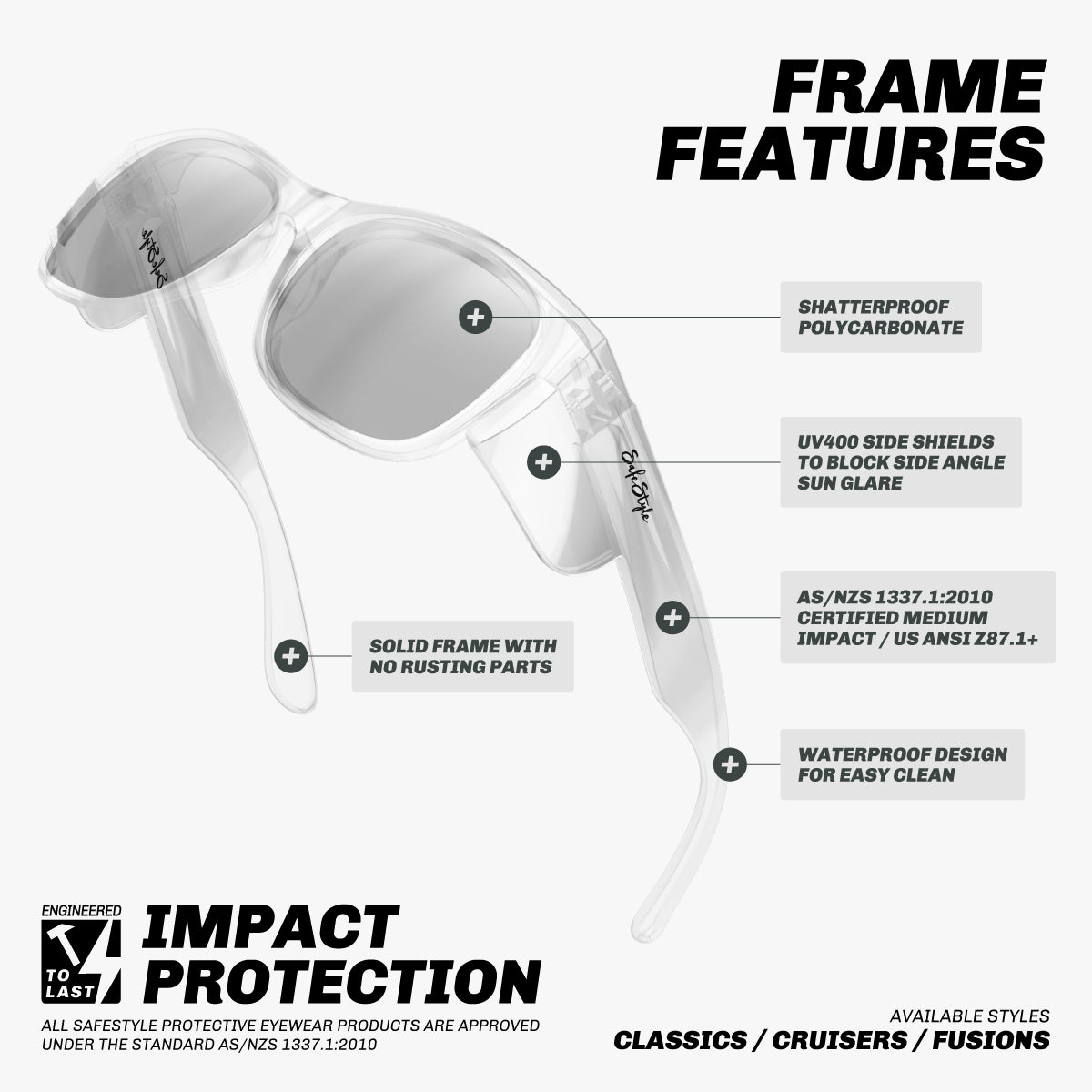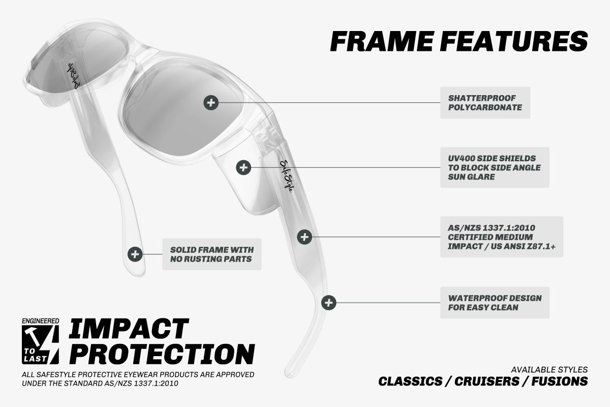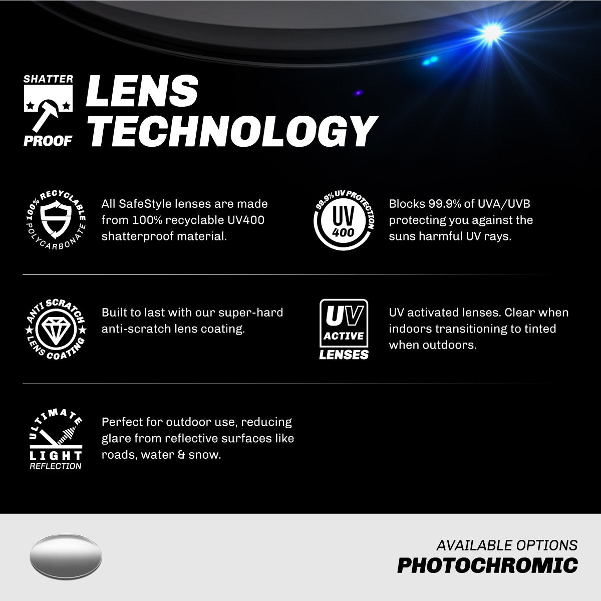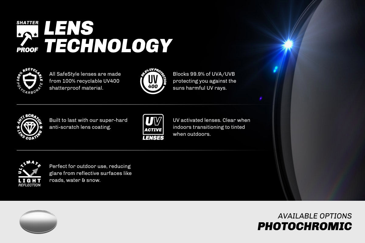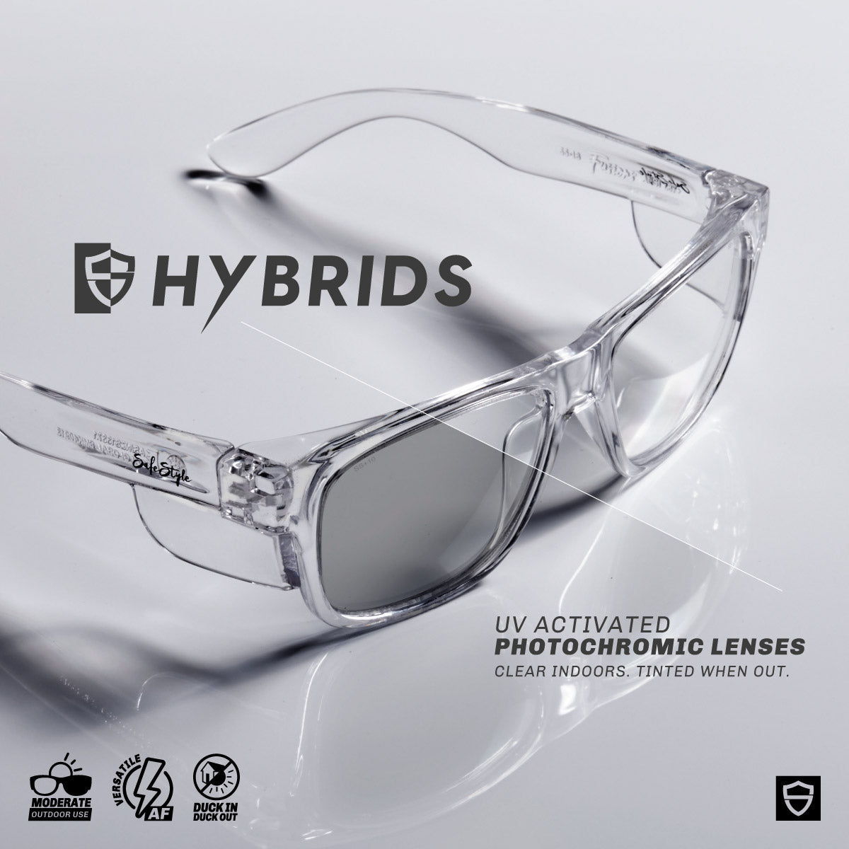 Experience adaptive protection with the SafeStyle Hybrids. Their UV-activated photochromic lens is perfect for those frequently switching between indoor and outdoor environments. The Hybrids adjust to changing light conditions, ensuring optimal clarity and protection wherever you go.