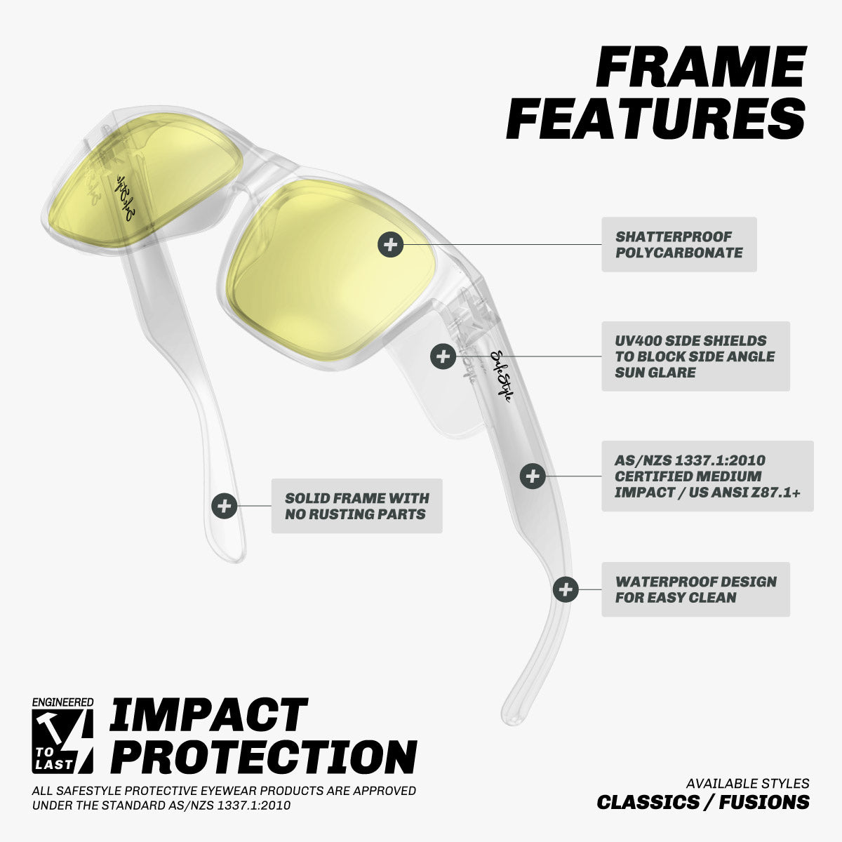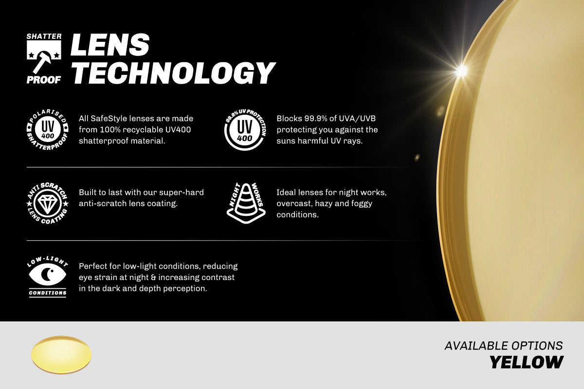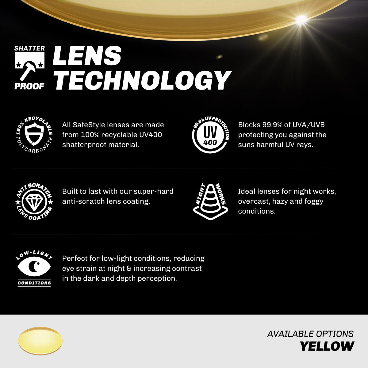 Enhance your vision in low-light conditions with SafeStyle's yellow lens safety glasses from the Night Shift collection. These safety glasses are specially designed to improve contrast, visibility and depth perception, keeping you safe and focused in the dark.