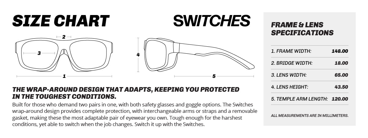 Built for those who demand two pairs in one, with both safety glasses and goggle options. The Switches wrap-around design provides complete protection, with interchangeable arms or straps and a removable gasket, making these the most adaptable pair of eyewear you own. Tough enough for the harshest conditions, yet able to switch when the job changes. Switch it up with the Switches.