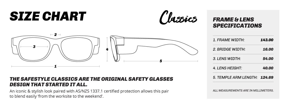 The SafeStyle Classics are the original safety glasses design that started it all. An iconic & stylish look paired with AS/NZS 1337.1 certified protection allows this pair to blend easily ‘from the worksite to the weekend