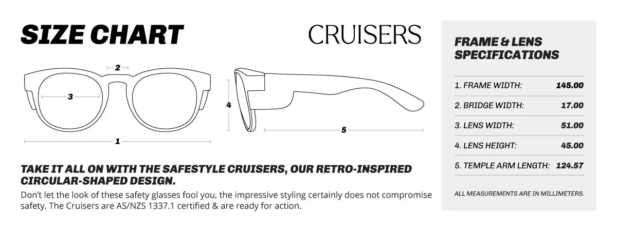 Take it all on with the SafeStyle Cruisers, our retro inspired circular-shaped lens that allows you to switch between work and play effortlessly. Don’t let the look of these safety glasses fool you, the impressive styling certainly does not compromise safety. The Cruisers are AS/NZS 1337.1 certified & are ready for action