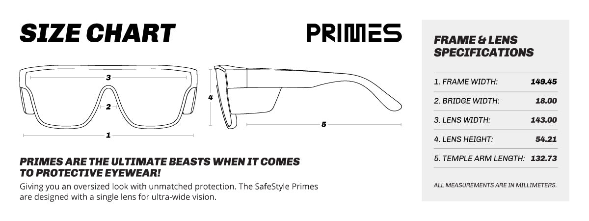 Go big or go home with the SafeStyle Primes. This one-piece, ultra-wide UV400 lens and oversized style set this release apart from anything you have ever seen. Make a big statement on and off the work site with the SafeStyle Primes safety glasses.