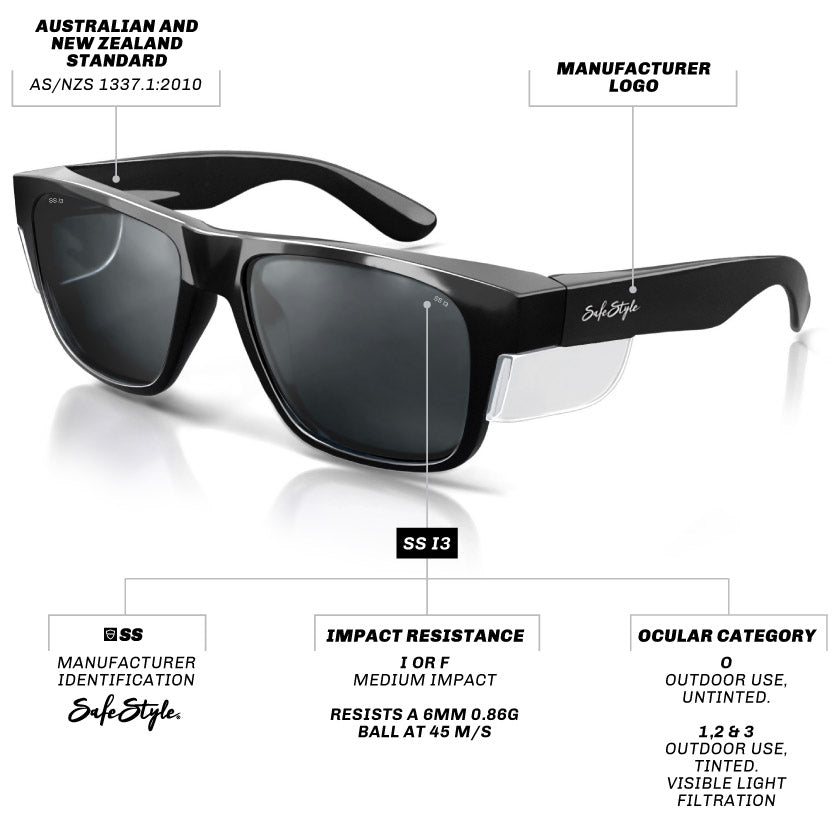 You can find the SAI Global and AS/NZS 1337.1 markings on our packaging, as well as on the arm of our safety glasses! Every frame in the SafeStyle Protective Eyewear range has undergone rigorous testing to ensure that they meet the safety and performance criteria outlined in the certification standards through SAI Global.