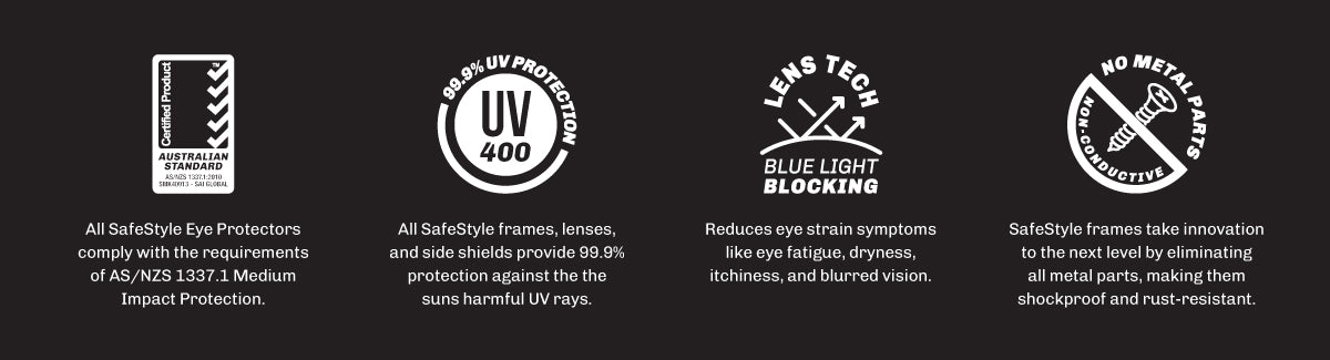 SafeStyle’s blue light filter lenses are perfect for indoor use around digital screens. They appear to look very similar as our clear lenses but have an impressive feature and are designed to filter out the harmful high-energy blue light frequencies from the visible light spectrum. SafeStyle lenses are specially engineered to filter some of the highest energy wavelengths of visible light (400-440 nm). The ideal lenses if you spend a significant part of your day in front of digital screens. All SafeStyle lenses are made from 100% recyclable UV400 shatterproof polycarbonate, blocking 99.9% of UVA/UVB with a super-hard anti-scratch coating.