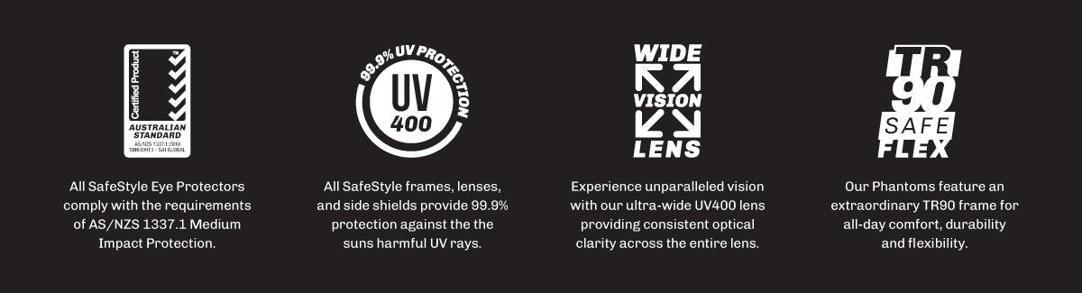 This AS/NZS 1337.1 certified sports-style safety glasses feature an extraordinary TR90 frame for all-day comfort, durability and flexibility. Your eyes will be shielded from all angles with our shatterproof, full-cover wrap-around lens designed for optimal vision.