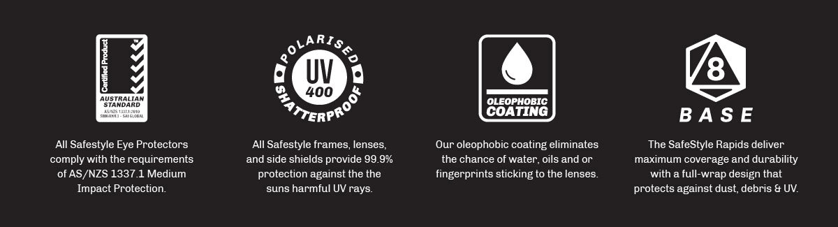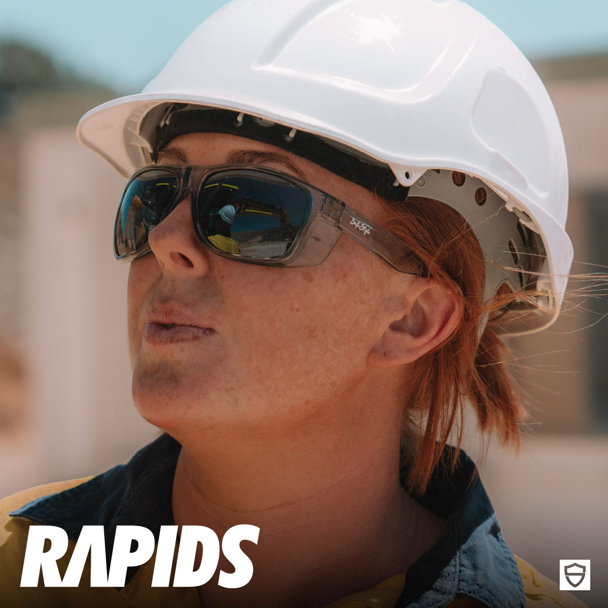 The SafeStyle Rapids are built for those who need maximum coverage and durability. This full-wrap design provides complete protection against dust, debris and UV without blocking peripheral vision.