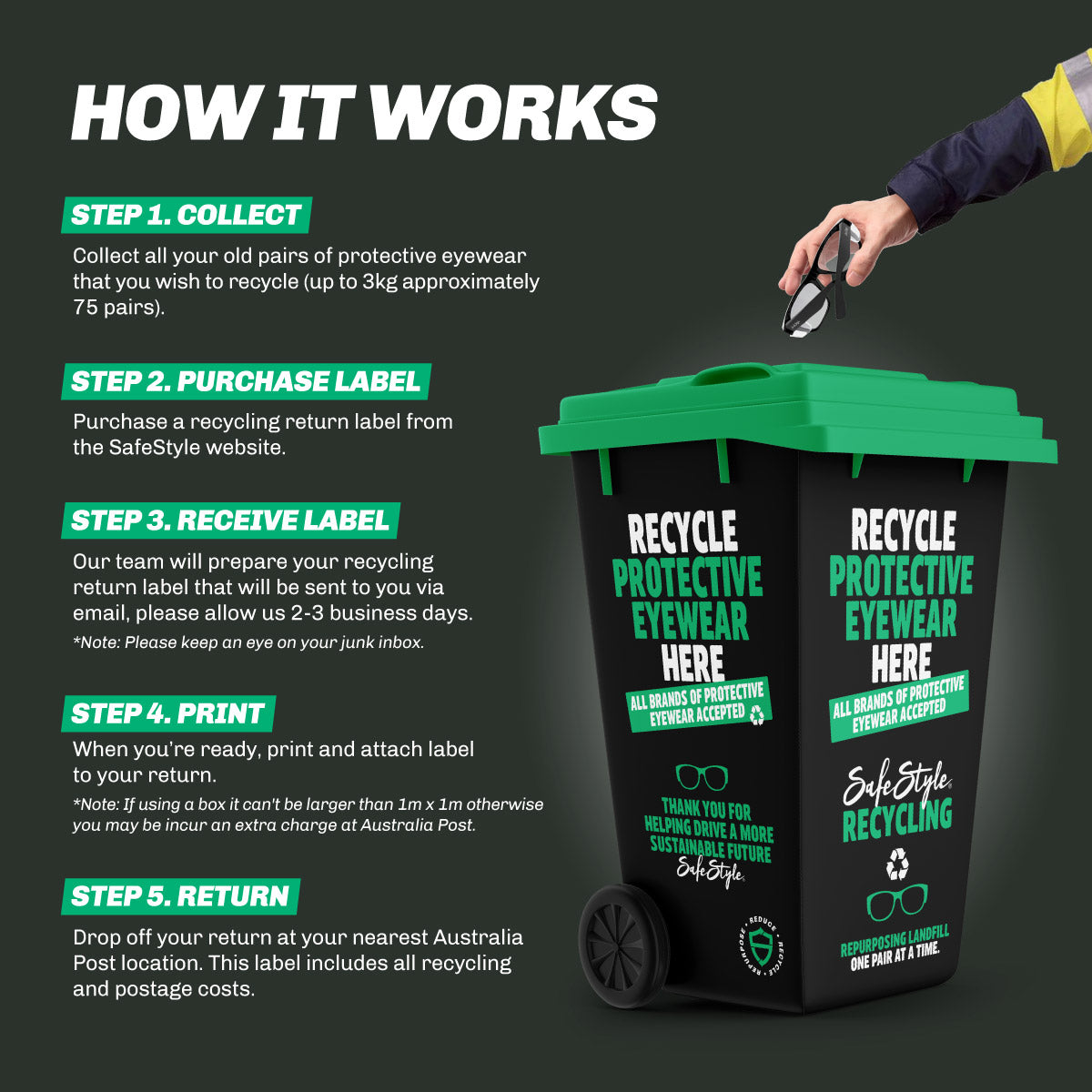 You can recycle ALL protective eyewear brands with the SafeStyle recycling label, including goggles and face shields.