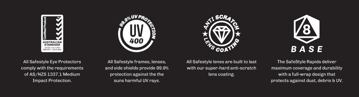 For those who never slow down, the SafeStyle Sonics deliver bold 90s wrap-around style with certified protection. Designed for speed and full-coverage safety, the fastback frame keeps up in the grittiest, dustiest, and most chaotic environments.
